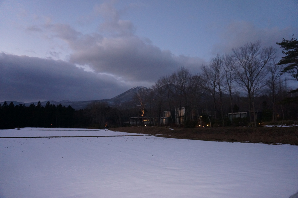 前回紹介した二期倶楽部の庭プロジェクト「木階」を過ぎて道を行くと、雪に覆われた田園風景が広がります。