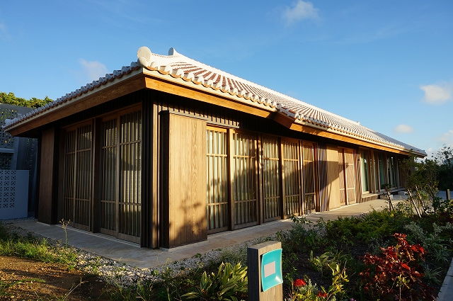 こちらが道場。沖縄を代表する赤瓦の屋根に開放的な窓、縁側のある平屋の建物です。